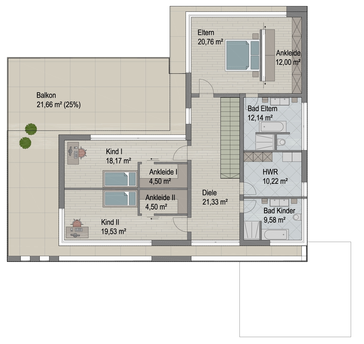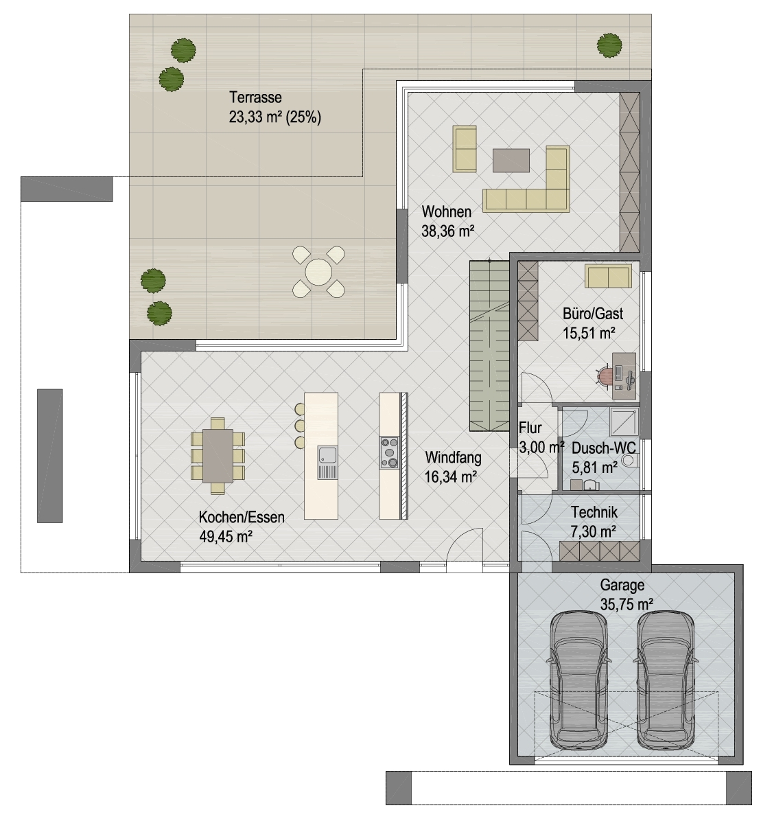 Dieses luxuriöse und moderne 2-geschossige Flachdachhaus mit 313 m² Wohnfläche lässt keine Wünsche offen. Bestimmt wird das Äußere von der weitauskragenden Decke mit dem daraus entstehenden Balkon, den massiven Sichtwänden und der großzügigen Terrasse. Der Außenbereich harmoniert perfekt zu dem Gebäude. Im Erdgeschoss befindet sich der offene, helle und große Wohn-, Ess- und Kochbereich, sowie ein zusätzliches Zimmer, ein Gäste-WC und die Doppelgarage, welche über den Technikraum erreichbar ist. Über eine einläufige Treppe gelangt man in den privaten Bereich des Hauses. Dort befinden sich die hellen und geräumigen Zimmer der Hausbewohner, jeweils mit separater Ankleide, 2 Badezimmer und der Hauswirtschaftsraum. Das Highlight ist die große Sonnenterrasse, die von allen Zimmern zugänglich ist und dazu einlädt seinen Alltag zu vergessen.