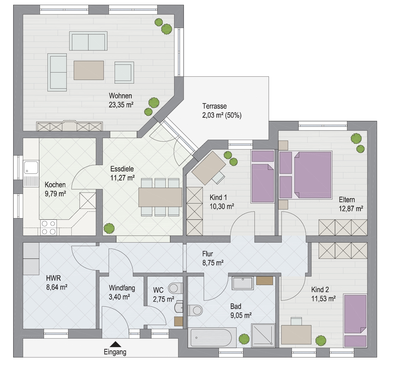 Unser Eckbungalow bietet Ihnen großen Wohnkomfort auf einer Ebene. Ohne lästige Treppe ist in diesem Haus alles leicht und bequem zu erreichen. Durch die Winkelanordnung des Gebäudes entsteht ein geschützter Außenbereich, der zum Relaxen einlädt.