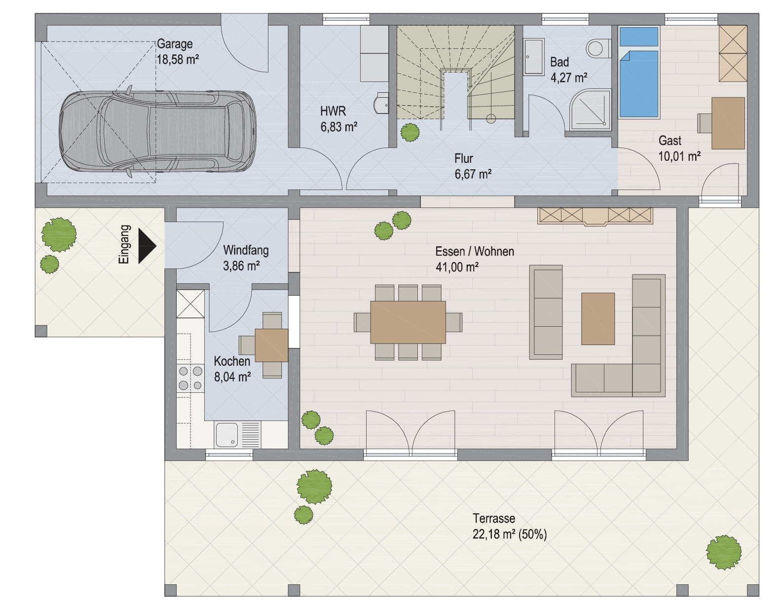 Ein klassisches Einfamilienhaus mit integrierter Garage, dessen Ausstrahlung zum einen durch das versetzte Pultdach, zum anderen durch einen Materialmix unterstrichen wird. 222 m² verteilen sich auf 2 Geschosse und bieten Lebensfreude pur. Die große Sonnenterrasse, sowie der darüber liegende, überdachte Balkon laden zum relaxen ein.