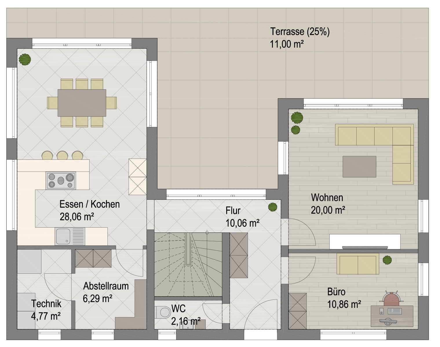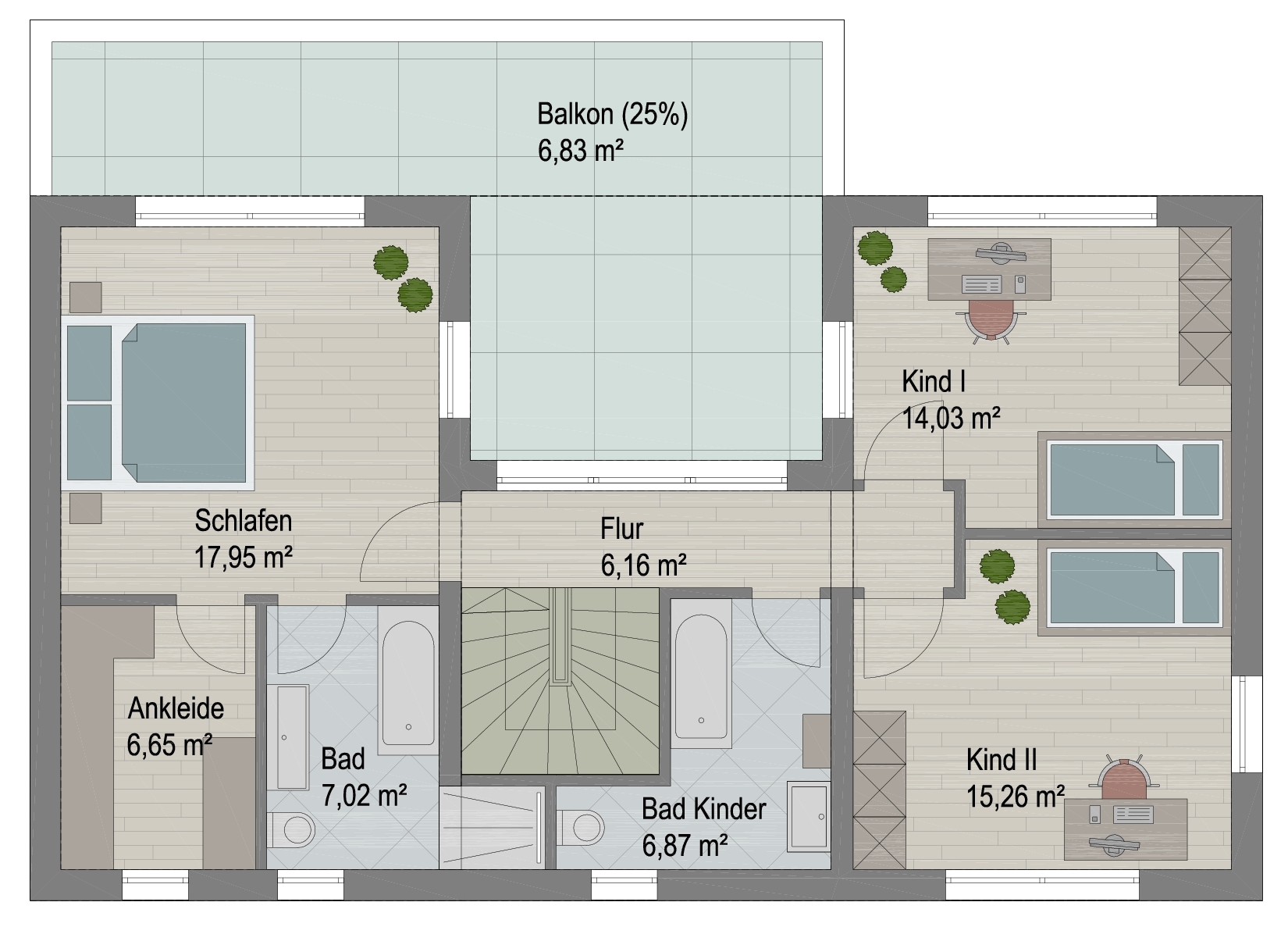 Dieses Haus wird durch eine klare und helle Architektur geprägt. Im Erdgeschoss befindet sich das kombinierte Esszimmer mit Küche, ein großzügiger Wohnbereich, sowie ein weiteres Zimmer, das als Büro oder Gästezimmer genutzt werden kann. Im Obergeschoss sind die Individualräume angeordnet: 2 Kinderzimmer mit eigenem Bad und der komfortable Elternbereich mit Ankleide und separatem Bad. Ein großer Balkon, der von zwei der Zimmer, sowie dem Flur betreten werden kann, bietet zusätzlichen Wohnkomfort.