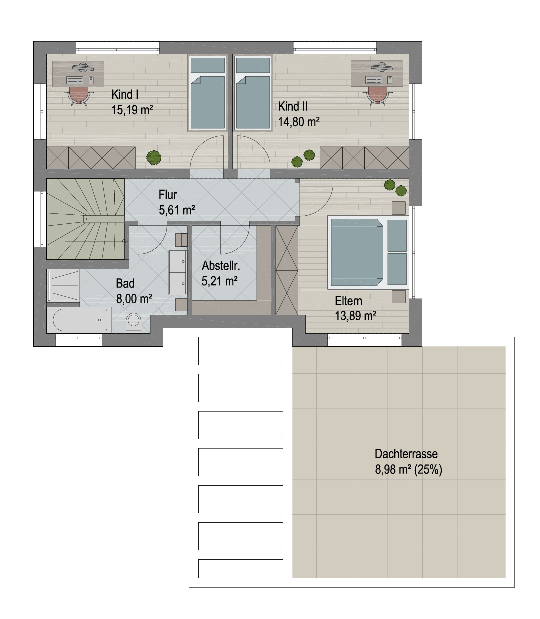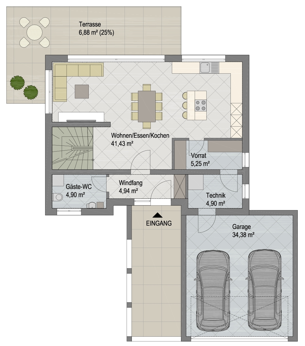 Diese klassisch geschnittene Einfamilienhausbesticht mit seinen klaren Linien, seiner raffinierten Eingangsüberdachung und der großen Dachterrasse über der Doppelgarage. 140 m² Wohnfläche verteilen sich im Erd- und Obergeschoss. Der offene Wohn-Ess- und Kochbereich wird über eine große Fensterschiebeanlage belichtet. Auch die Räume im Obergeschoss werden über große Fensterflächen mit Licht durchflutet. Alles in allem ein Haus zum Wohlfühlen.